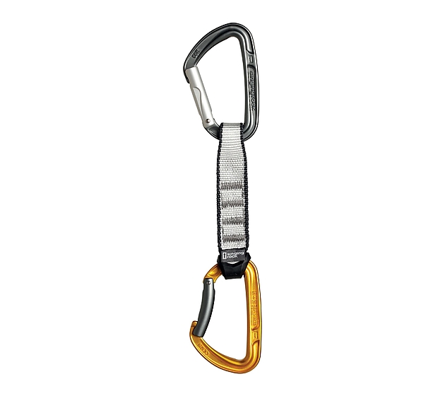 Full-size hot-forged durable quickdraw with solid gates intended for sport climbing