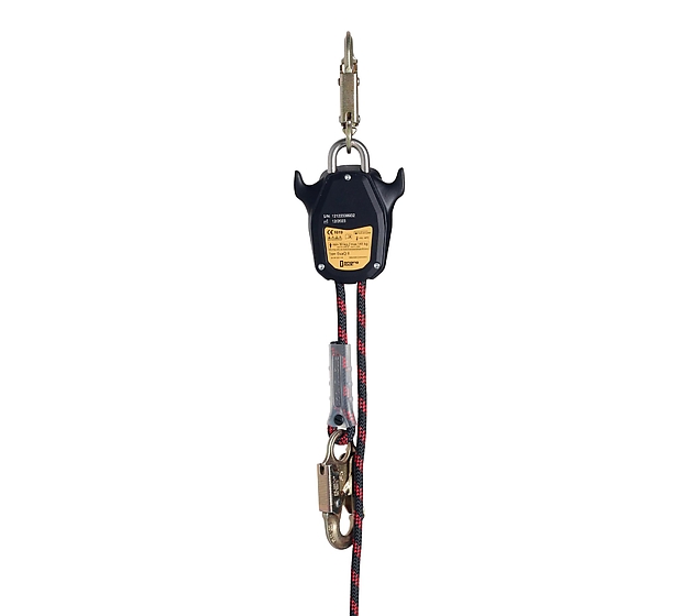- both ends of the rope are equipped with a stitched eye and a steel double trigger automatic locking connector with a gate opening of 21 mm