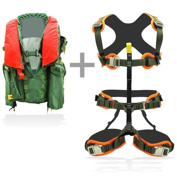 The TARGET PRO AERO KIT has been conceived and designed to safely suspend and secure helicopter rescuers during helicopter rescue operations, both inside the aircraft and during winch phases. The kit consists of a harness combined with a life jacket, with the life vest ensuring buoyancy in case of emergency. The life jacket is activated by means of a special self-inflating command through a CO2 cylinder.