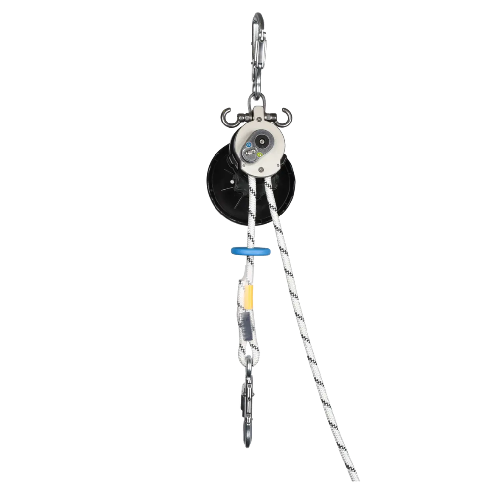 - Pre-assembled with 9.8 mm kernmantle rope with certified end connections and color coding at the ends of the rope