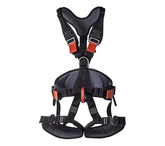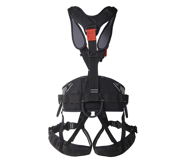 Fully adjustable harness for rope access with a padded wide waist belt, leg loops and shoulder straps. Suitable for work positioning, fall arrest and work restraint situations. This harness is specially intended for workers at offshore oil platforms.