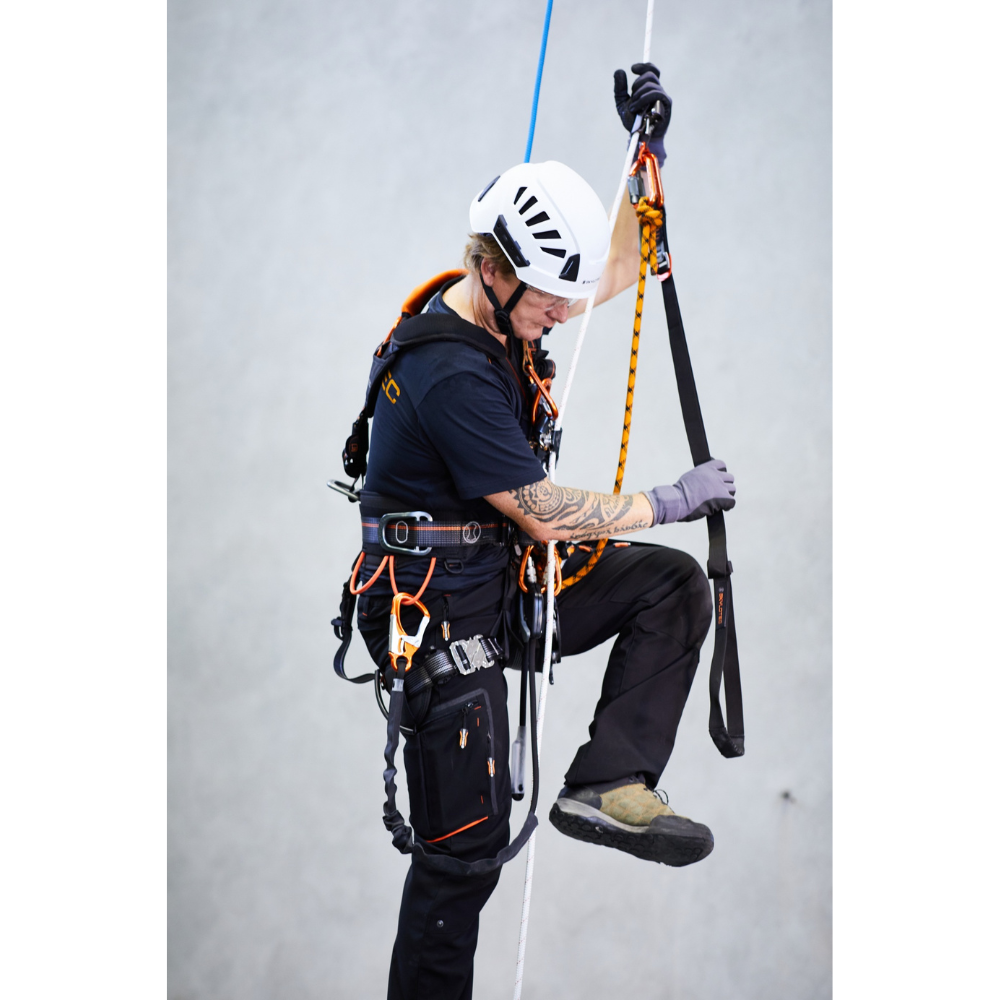 This flexible loop ascender can be particularly well adjusted to the size of the user, especially for very large people. The second hand, which is not operating a rope clamp like the GET-UP during ascent, fits perfectly in the integrated handle. With the very large ascender foot opening, feet find solid hold quickly and safely. It can also be used for lifting persons.