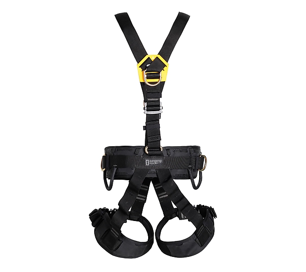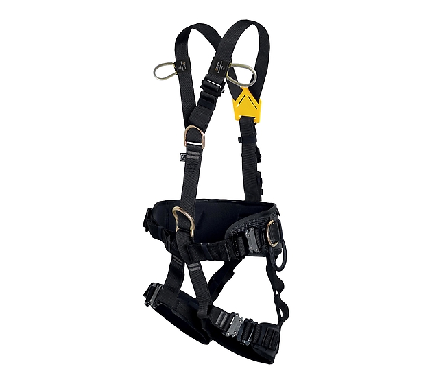 Fully adjustable full body harness for rope access, work positioning and fall arrest with SPEED buckles, steel components, fall indicator and connector keepers.