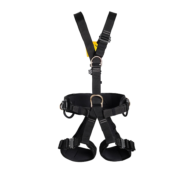 Fully adjustable full body harness for rope access, work positioning and fall arrest with SPEED buckles and steel components.