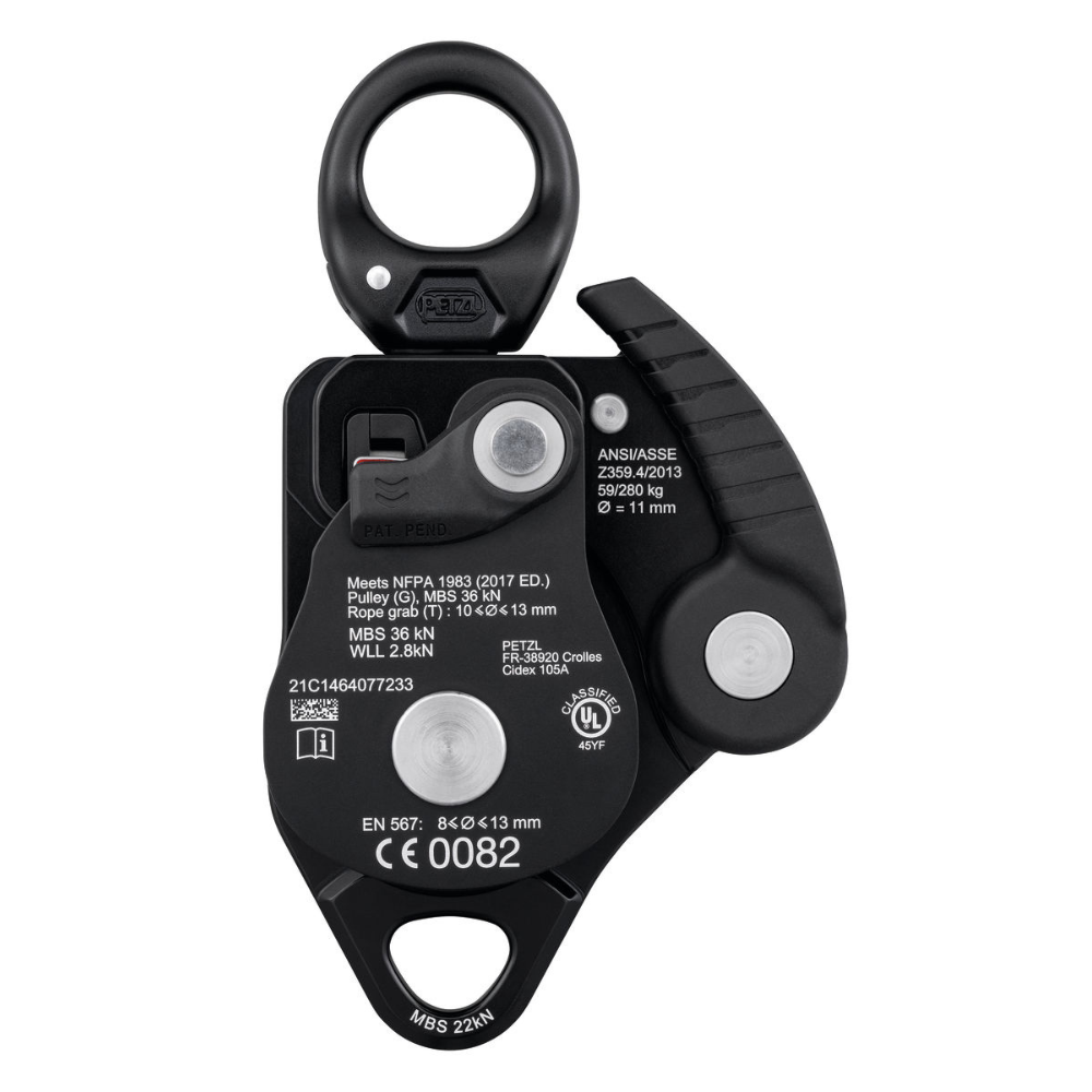 Releasable, the TWIN RELEASE progress capture pulley is designed to set up 4:1 haul systems for work in confined spaces or for technical rescue. Releasing the cam is possible with the ergonomic handle. The brake integrated into the moving side plate and the main faceted sheave with single-direction rotation, offer additional braking and better control when lowering heavy loads. The two sheaves provide excellent hauling efficiency. The swivel facilitates operations, allowing the pulley to be oriented under load and direct connection of carabiners, ropes, or slings.